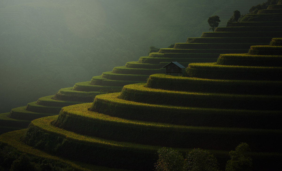 - Rice fields on terraced of Mu Cang Chai District at sunrise time, YenBai province, Northwest Vietnam, worm tone