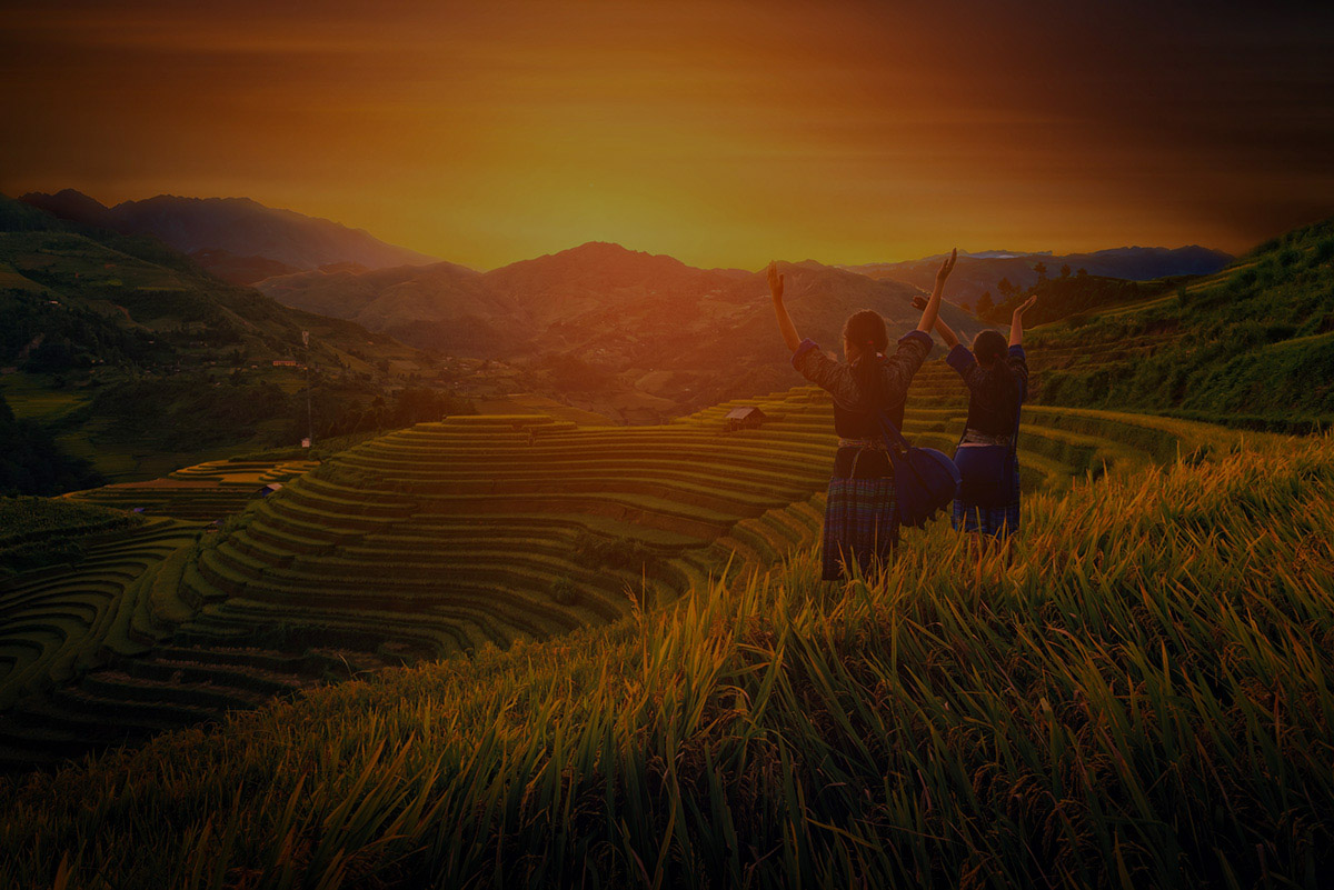 - Vietnamese Hmong children raising arm on Rice fields terraced at sunset in Mu Cang Chai, YenBai, Vietnam.